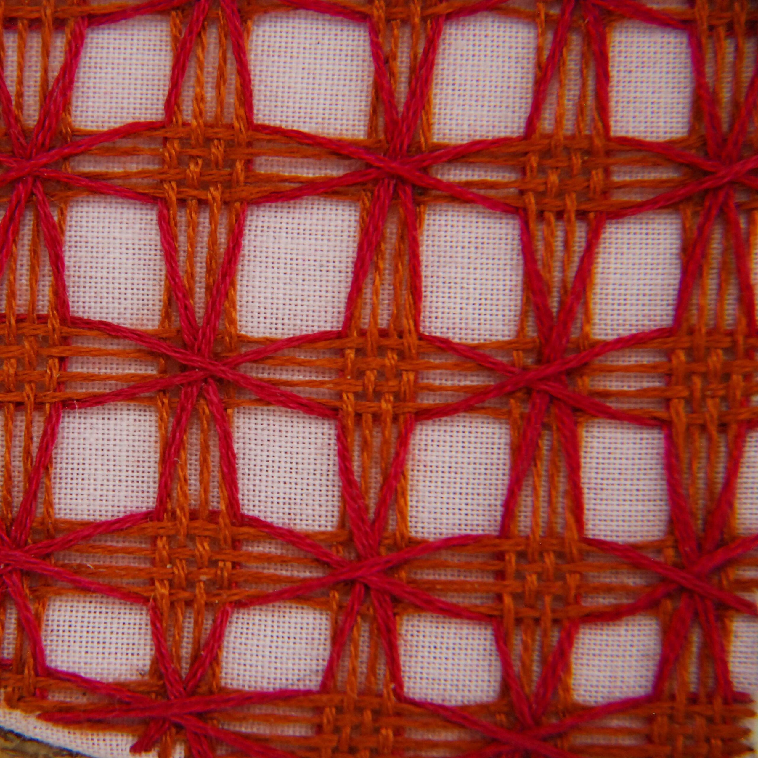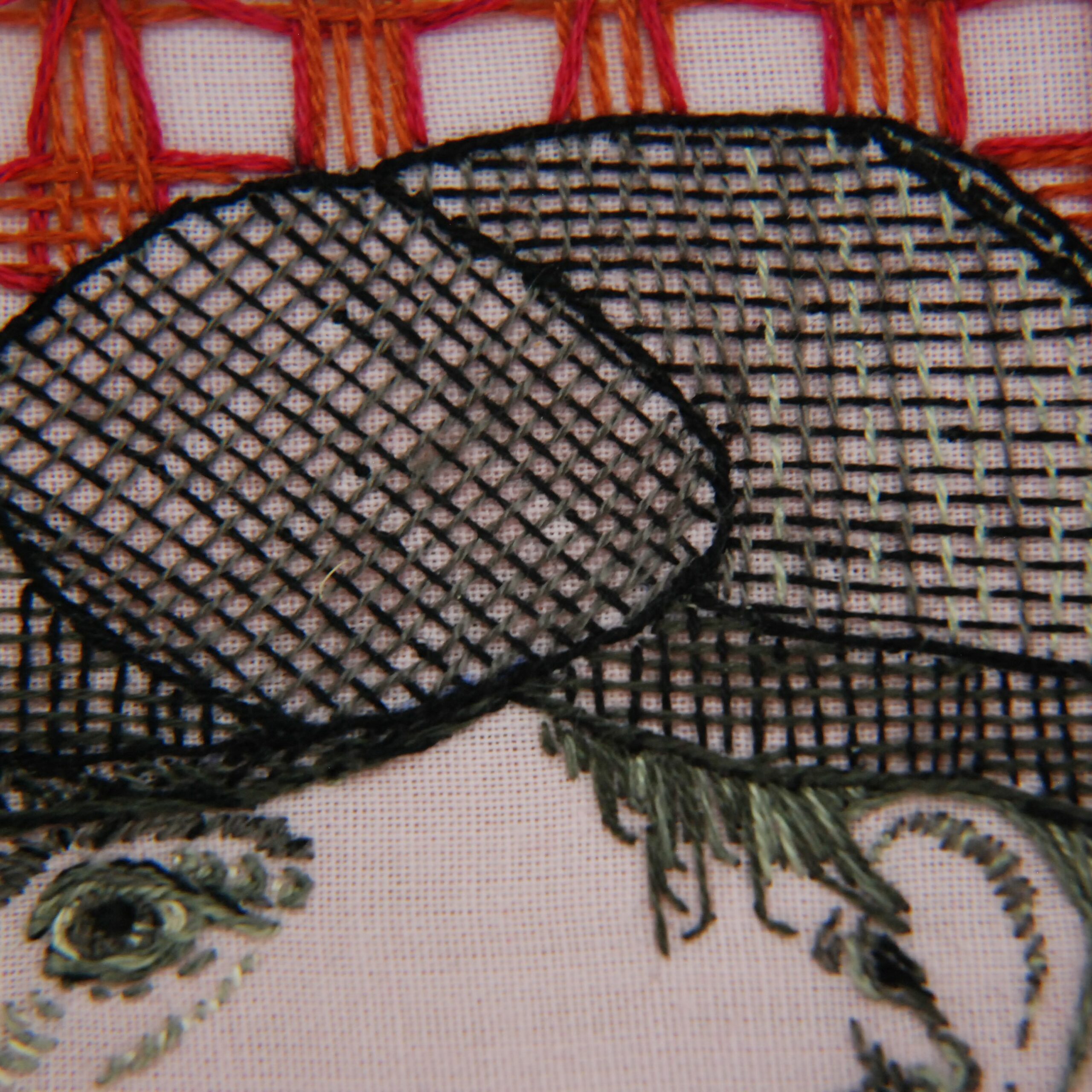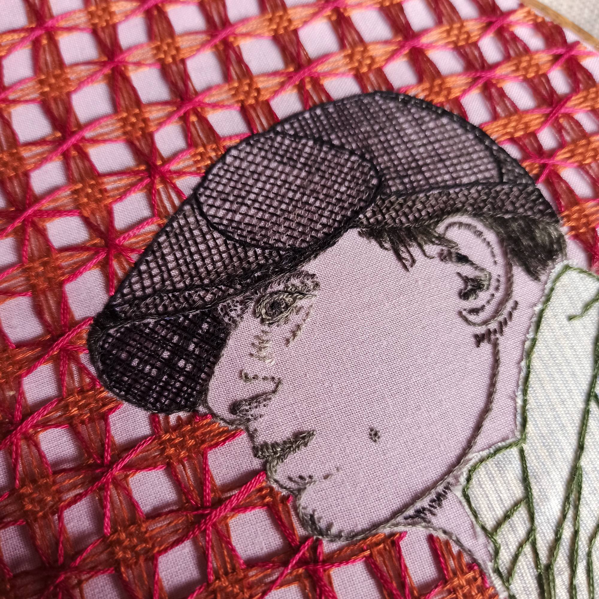Do portretu dobieram ciekawą paletę kolorów zgodną z kołem barw oraz współgrające kolorem i fakturą tkaniny. Każdy obraz posiada wypełnioną całą powierzchnię materiału rozciągniętego na tamborku. Pierwszą część powierzchni zajmuje twarz (głowa) portretowanej osoby. Druga część to ubranie wykonane z innej, ciekawej tkaniny z ozdobnymi przeszyciami. Natomiast trzeci element to plecione tło. Na koniec całość jest oprawiona w ozdobny ramko tamborek z motywem drewna i ozdobnym wieszaczkiem.